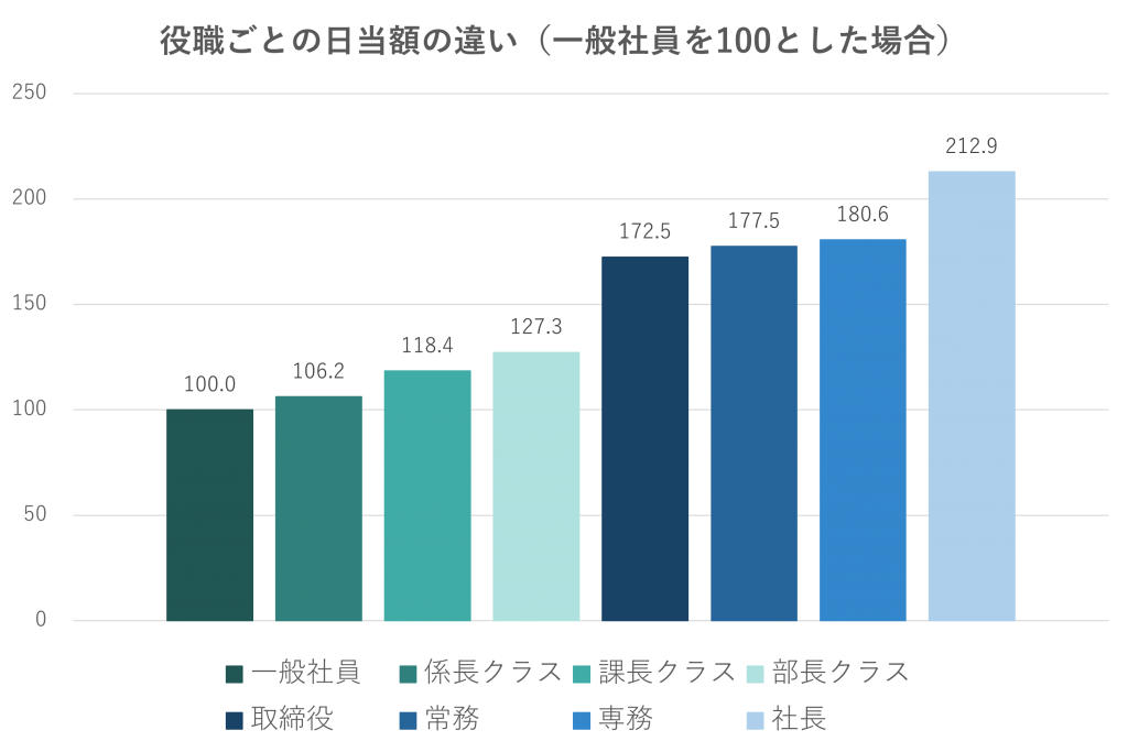 なお、産労総合研究所が実施した調査「2019年度 国内・海外出張旅費に関する調査」によると、一般社員の日当を100とした場合、部長クラスは127.3、取締役クラスは172.5、社長が212.9という結果が出ています(日帰り出張の場合)。