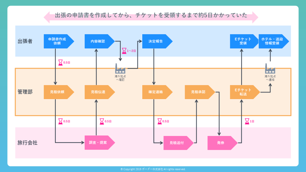 フライト手配は、旅行代理店と出張する従業員、4カ所ある海外拠点との間に総務担当者が入り進めていました。業務内容はほとんど伝言メールや電話が作業の多くを占めていたため、関係者が情報共有できるトークルームのような物があれば便利だと思っていました。雑誌で細谷社長の記事を読んだ上司から紹介があり、「まさに探していたシステムだ」と思い、BORDERの検討を開始することになりました。
