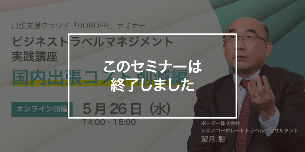 | プログラム | 13:50 ウェビナー会場オープン 14:00 ウェビナーの流れ、注意事項等の説明 14:05 <国内出張コスト削減編>ビジネストラベルマネジメント実践講座 14:50 質疑応答 |