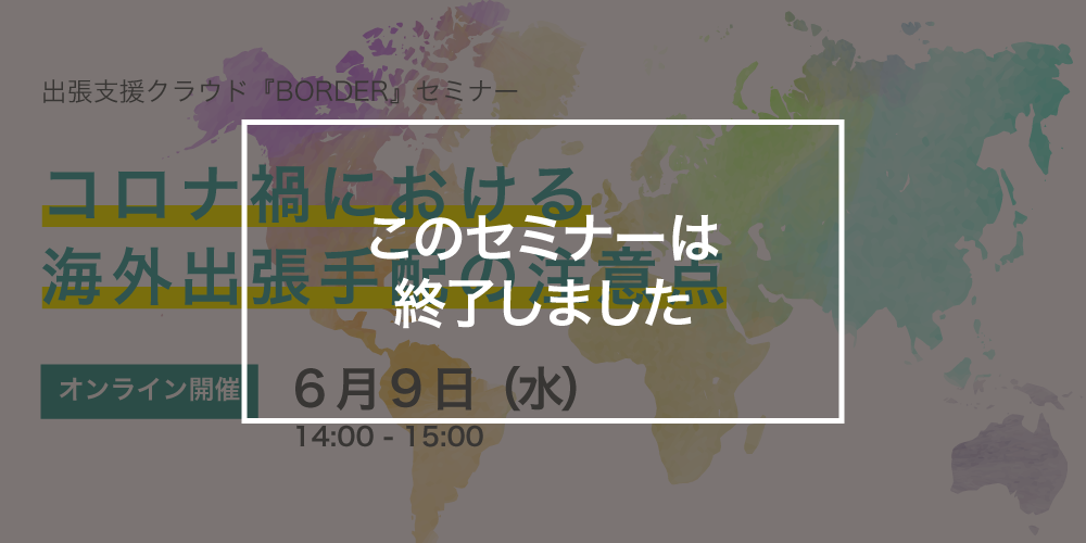 | プログラム | 13:55 ウェビナー会場オープン 14:00 ウェビナーの流れ、注意事項等の説明 14:05 コロナ禍における海外出張手配の注意点 14:50 質疑応答 |