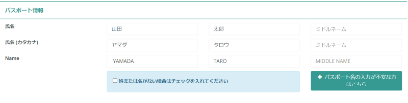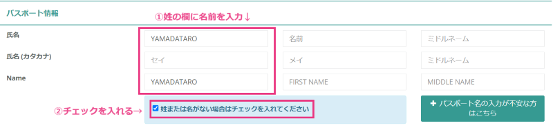 パスポート上で姓名の区切りがない場合は、以下のようにご入力ください。