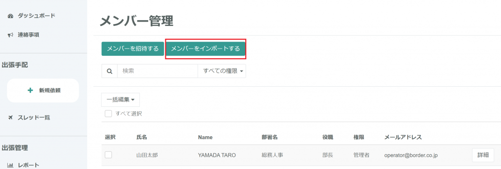 BORDERを初めて導入する際や、人事異動や新入社員の入社等でメンバー情報更新・登録を行う際に、管理者権限のユーザーがCSVデータで一括登録・編集ができます。複数のメンバー情報を更新する際はこちらをご活用ください。
