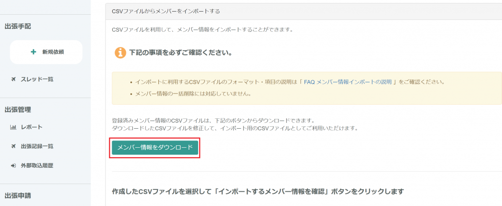 次にメンバーのインポートへ画面が遷移したら、「メンバー情報をダウンロード」をクリックします。その後、メンバー情報インポート専用CSVファイルがダウンロードされます。