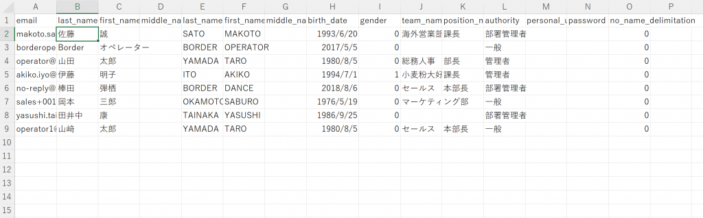 既にメンバー登録している場合、ダウンロードしたメンバー情報インポート専用CSVファイルにはBORDER上に登録済みメンバー情報が反映されます。