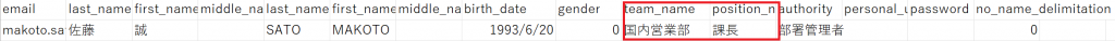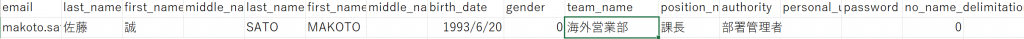 一つ例として佐藤誠さんが異動により所属部署が海外営業部から国内営業部と変更されたとします。その際は下記のようにメンバー情報インポート専用CSVデータのteam_nameを国内営業部へと変更してください。