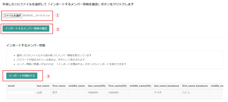・必ず新規メンバーのみをCSVファイルに入力ください。既に登録してあるメンバー登録への誤記入を防ぐ為に新規メンバーのみでインポートすることを推奨しております。