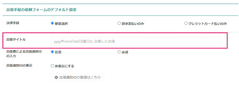依頼フォーム内の「出張識別ID」の入力について設定が可能です。