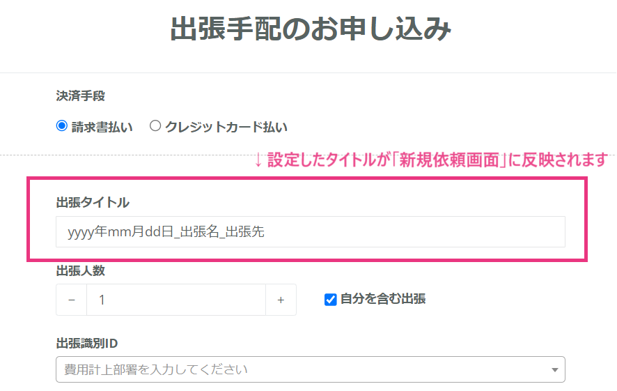 出張タイトルを設定すると、新規依頼画面に以下のように反映されます。