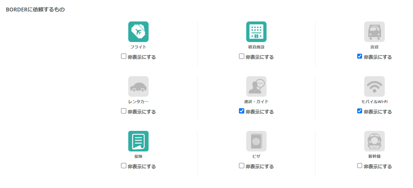 ・「非表示にする」をチェック … アイコンが非表示になり、出張者は手配物を選択できません。