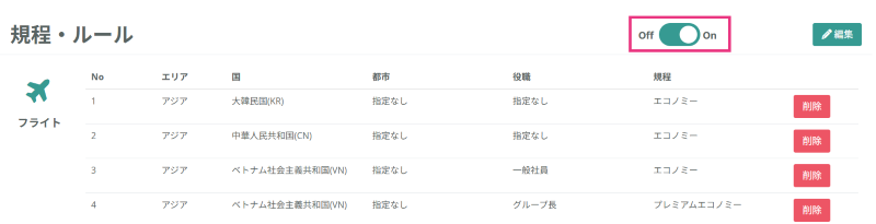 フライトの規程は、エリヤ、国、都市、役職、座席クラス、上限金額の設定が可能です。作成した規程を削除したい場合は、削除ボタンからお取消しいただけます。