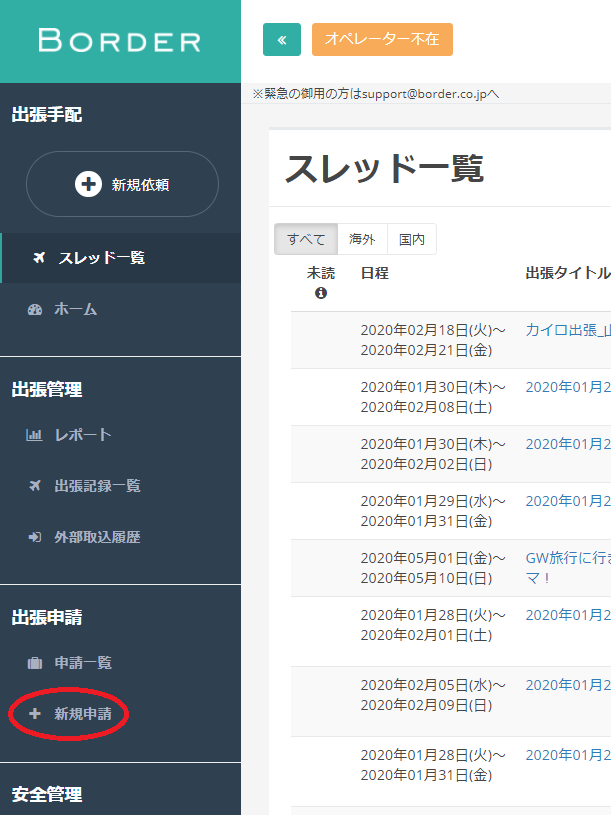 左メニュー出張申請内の「新規申請」をクリックします。