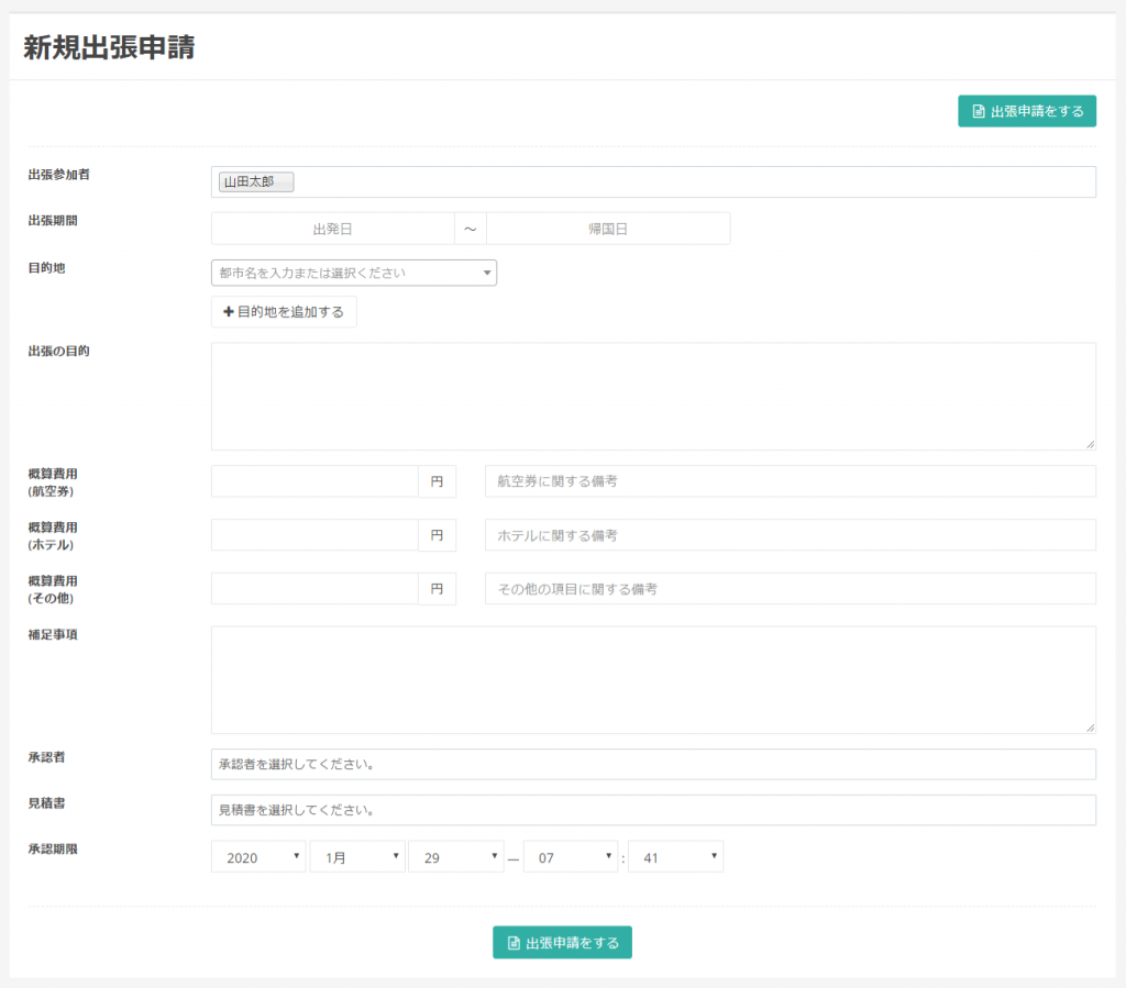 未入力の出張申請が表示されるので、必要な項目を入力して「出張申請をする」をクリックします。