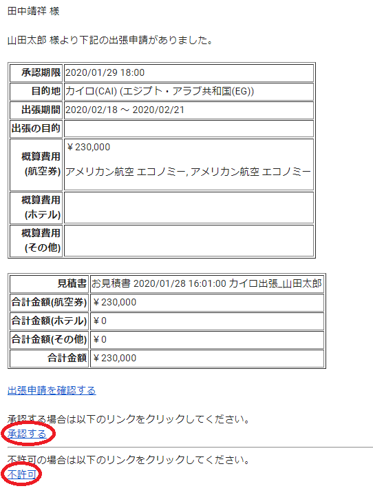 承認者はメール内の申請内容を確認し、「承認する」「不許可」どちらかのリンクをクリックすることで、アクションを完了させることが可能です。