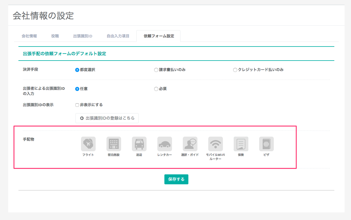 出張手配依頼フォームのデフォルト設定機能で、「手配物」の設定が行えるようになりました。