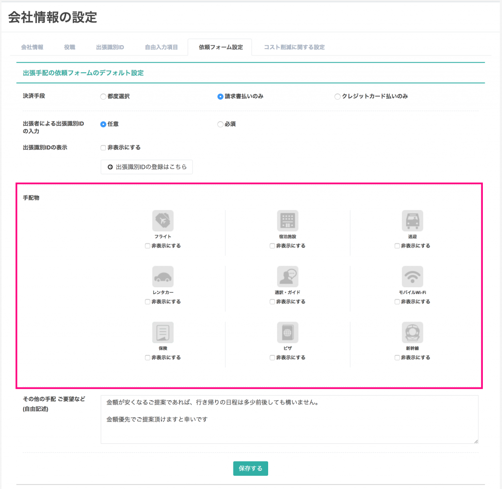 新規依頼フォームに表示させる手配物アイコンを設定できます。BORDERに依頼する必要がない手配物を出張者が誤って手配依頼することを防げます。