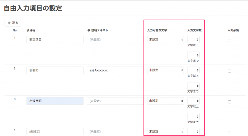 自由入力項目に入力規則を設定できます。管理者が意図しない内容を出張者が誤って入力することを防げます。