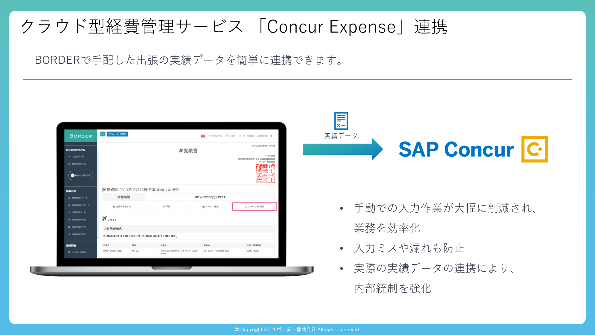 ボーダー株式会社(本社:東京都新宿区、代表取締役:細谷智規、以下ボーダー)が運営するクラウド海外出張手配・管理サービス「BORDER」と、株式会社コンカー(本社:東京都中央区、代表取締役社長:三村真宗、以下コンカー)が運営する中小企業向けクラウド型経費精算・管理サービス 「Concur Expense Standard」のシステム連携を開始いたします。