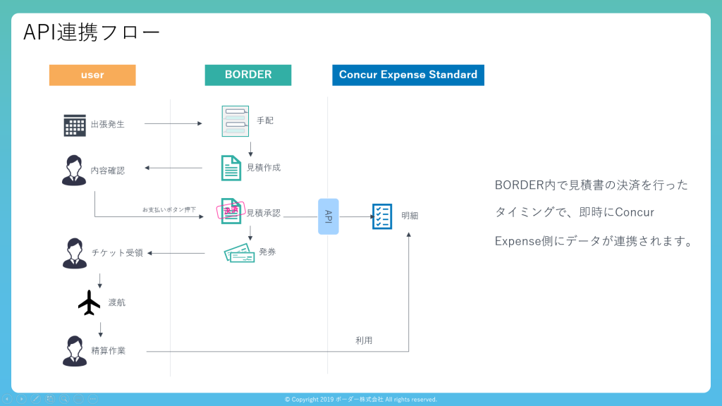 現状出張手配は「BORDER」で行い、自動連携されたデータをもとに経費精算を「Concur Expense」で行う必要があります。今後は出張手配と経費精算のシステムをよりシームレスに利用していただけるよう、システムの連携を強化してまいります。