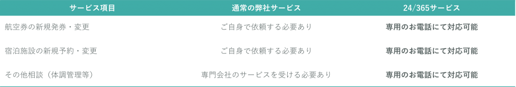 渡航中のご出張者が安心して現地で滞在できるように24時間365日サポートプラン(以下、「24/365サポートプラン」と言います。)の提供を開始しました。本プランを活用することで、弊社の営業時間外でも、専用の窓口を通じて、航空券の新規発券や変更・取消が可能になりました。